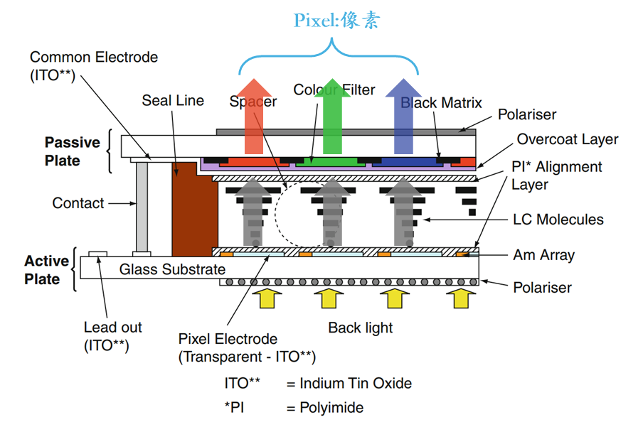 LCD (skystųjų kristalų ekranas), kaip brandžiausias ir plačiausiai naudojamas ekrano sprendimas, veikia tokiu pagrindiniu principu: foninio apšvietimo įrenginys skleidžia baltą šviesą, kuri praeina per poliarizatorius ir skystųjų kristalų sluoksnį, kol pasiekia RGB spalvų filtrus ir sukuria tris pagrindines spalvas. Galiausiai, kiekvieno pikselio ryškumas reguliuojamas kontroliuojant skystųjų kristalų molekulių orientaciją naudojant įtampą. Šis procesas priklauso nuo kelių pagrindinių komponentų koordinuoto darbo: foninio apšvietimo bloko, TFT matricos, skystųjų kristalų sluoksnio ir spalvų filtrų.