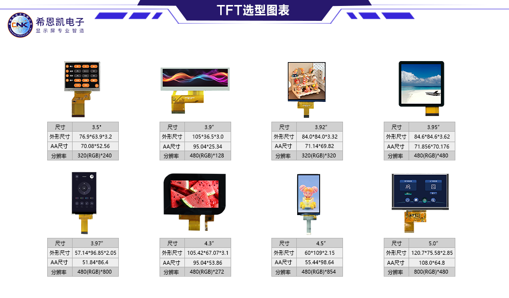 Kalbant apie spalvoto ekrano TFT modulius, įmonė įvaldė visą gamybos procesą nuo stiklo pjovimo, poliarizatoriaus tvirtinimo iki tvarkyklės IC sujungimo ir foninio apšvietimo surinkimo. Jos produktai palaiko įvairius vairavimo metodus, tokius kaip RGB sąsaja, MCU sąsaja ir SPI sąsaja, ir gali lanksčiai prisitaikyti prie skirtingų pagrindinių valdymo platformų.